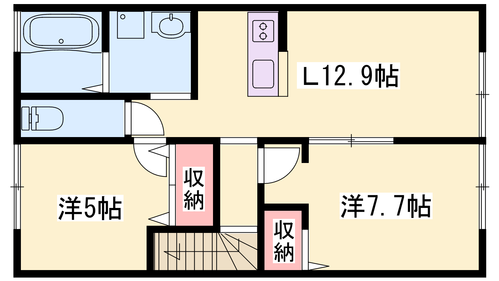 - LDK12.9帖、洋室7.7帖、洋室5帖