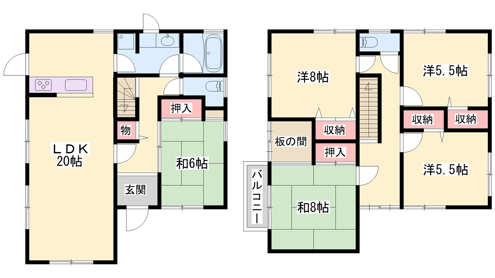 - LDK20帖、洋室8帖、洋室5.5帖、洋室5.5帖、和室8帖、和室6帖