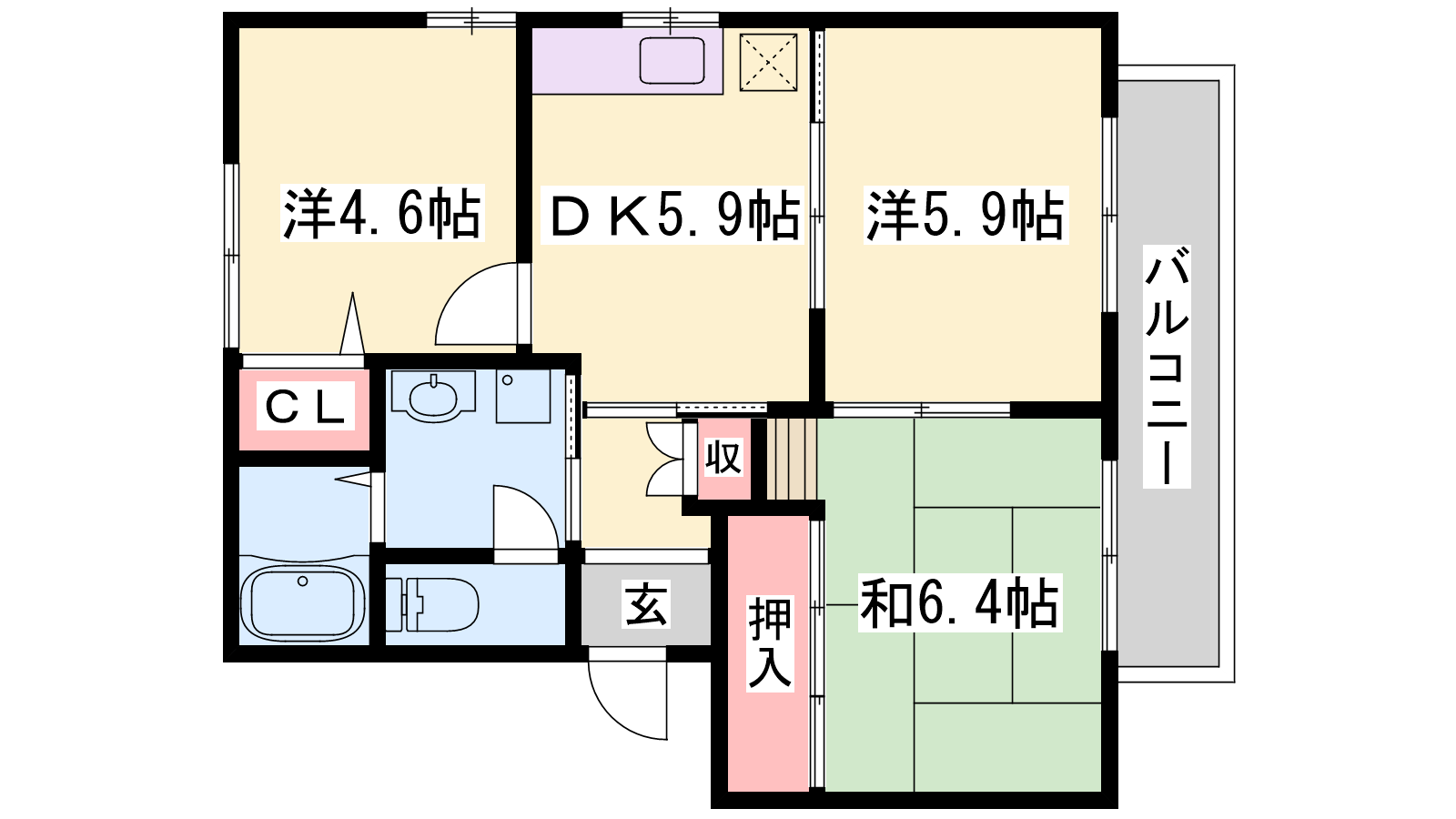 - K5.9帖、洋室5.9帖、洋室4.6帖、和室6.4帖