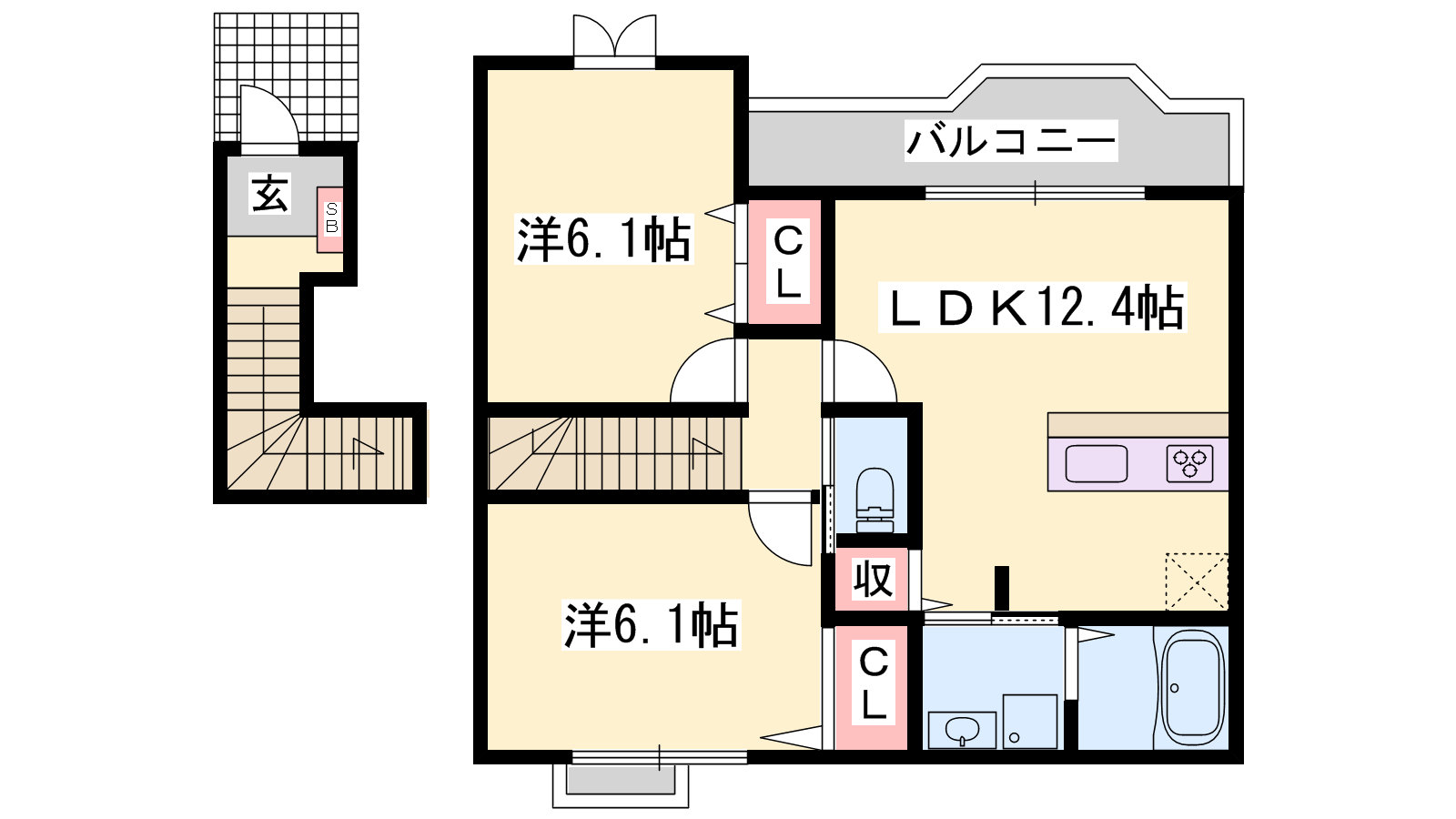 - LDK12.4帖、洋室6.1帖、洋室6.1帖