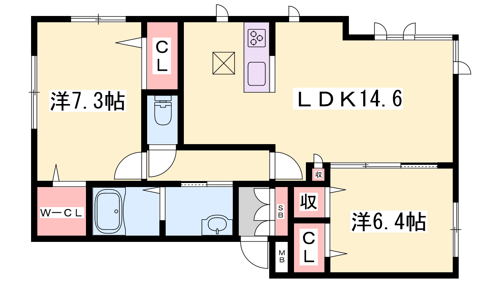- LDK14.6帖、洋室7.3帖、洋室6.4帖