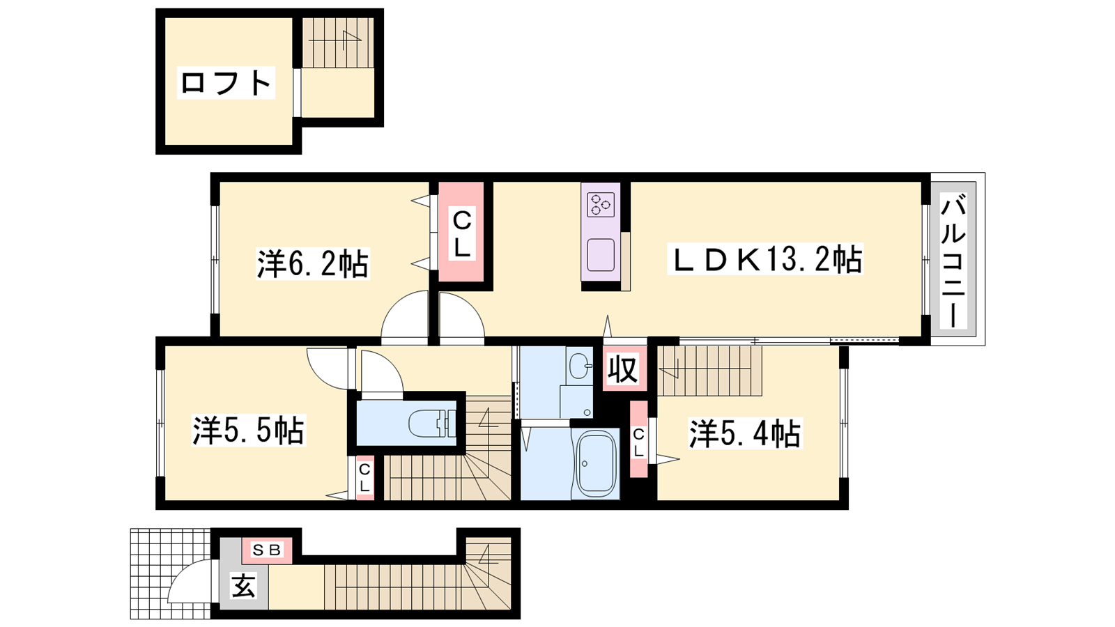 - LDK13.2帖、洋室6.2帖、洋室5.5帖、洋室5.4帖