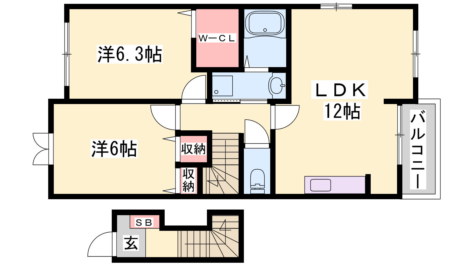 - LDK12帖、洋室6.3帖、洋室6帖