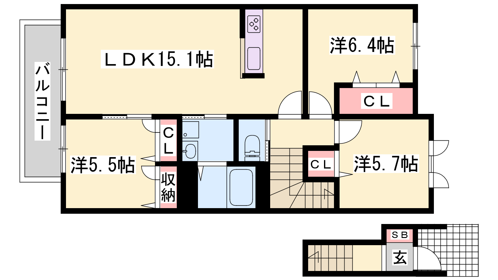 - LDK15.1帖、洋室6.4帖、洋室5.7帖、洋室5.5帖