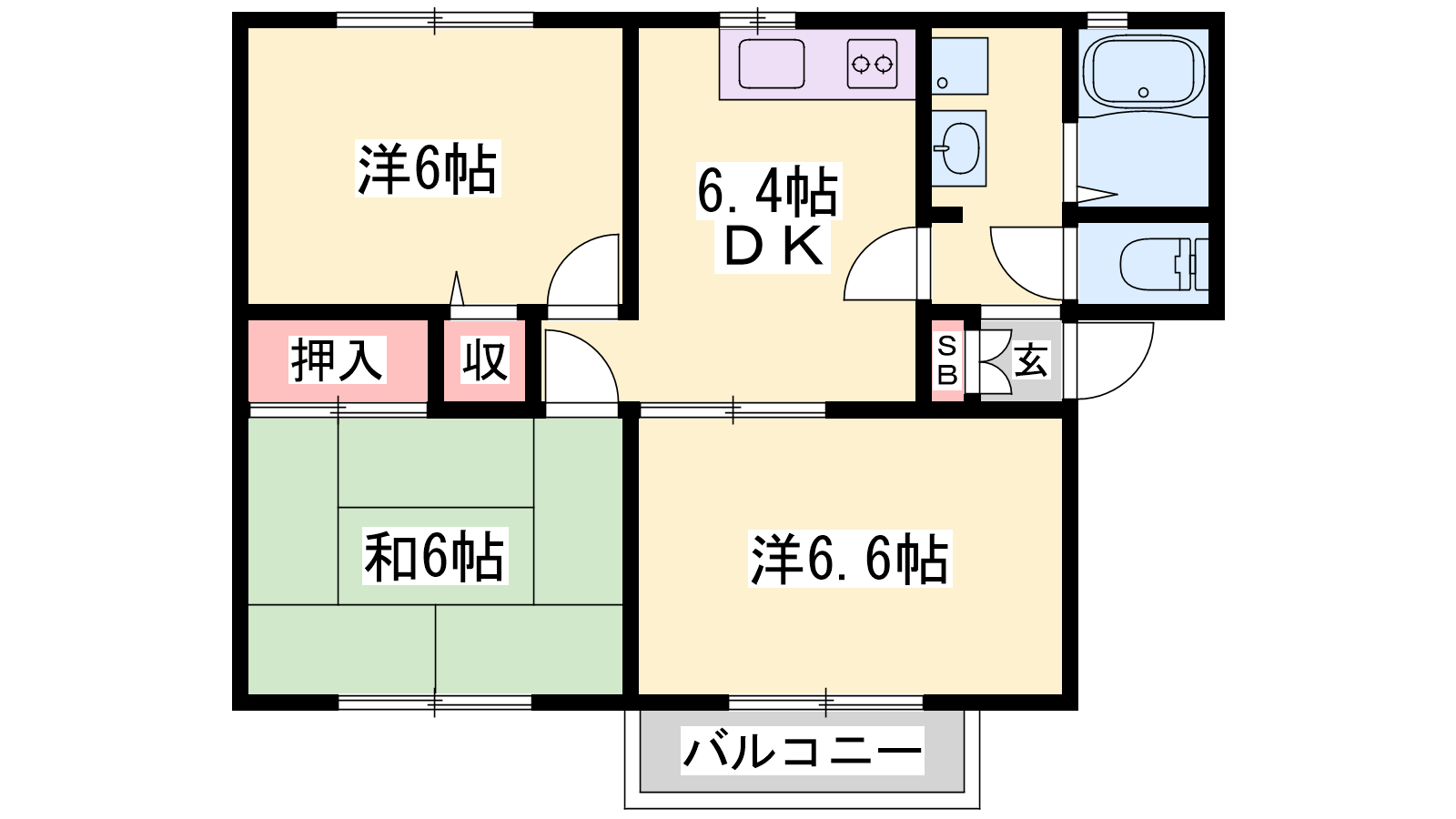 - DK6.4帖、洋室6.6帖、洋室6帖、和室6帖