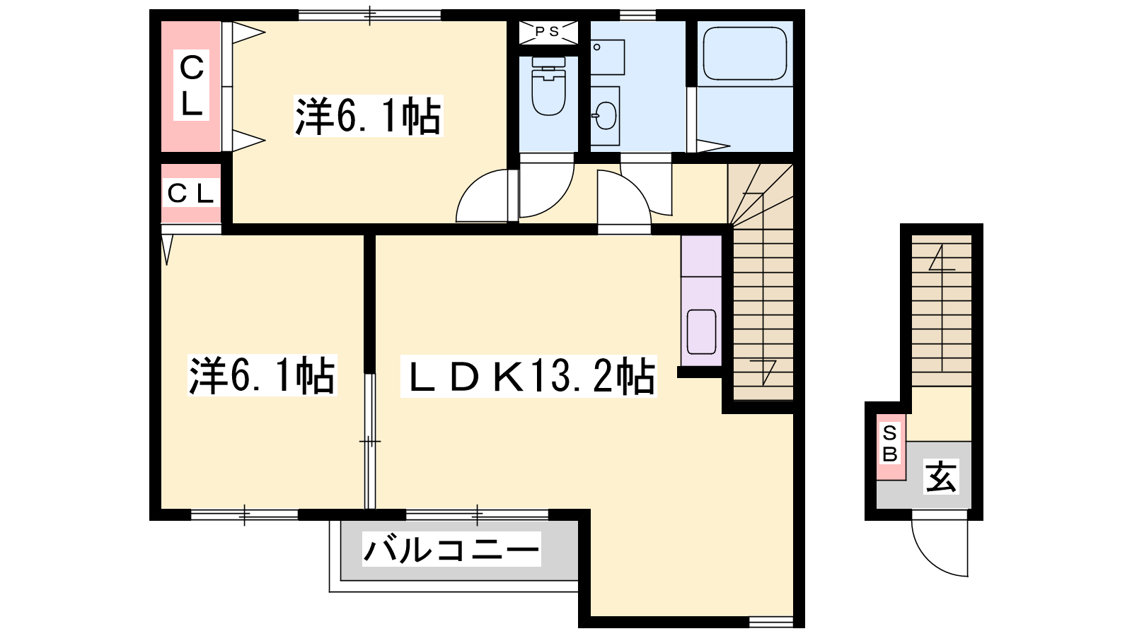 - LDK13.2帖、洋室6.1帖、洋室6.1帖