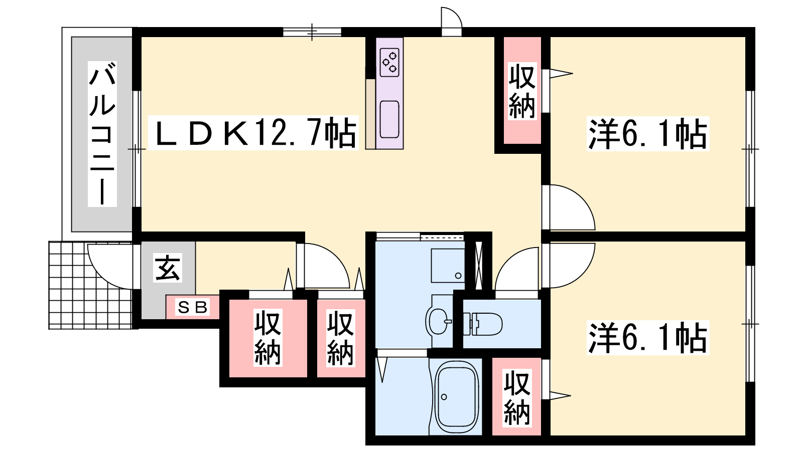 - LDK12.7帖、洋室6.1帖、洋室6.1帖