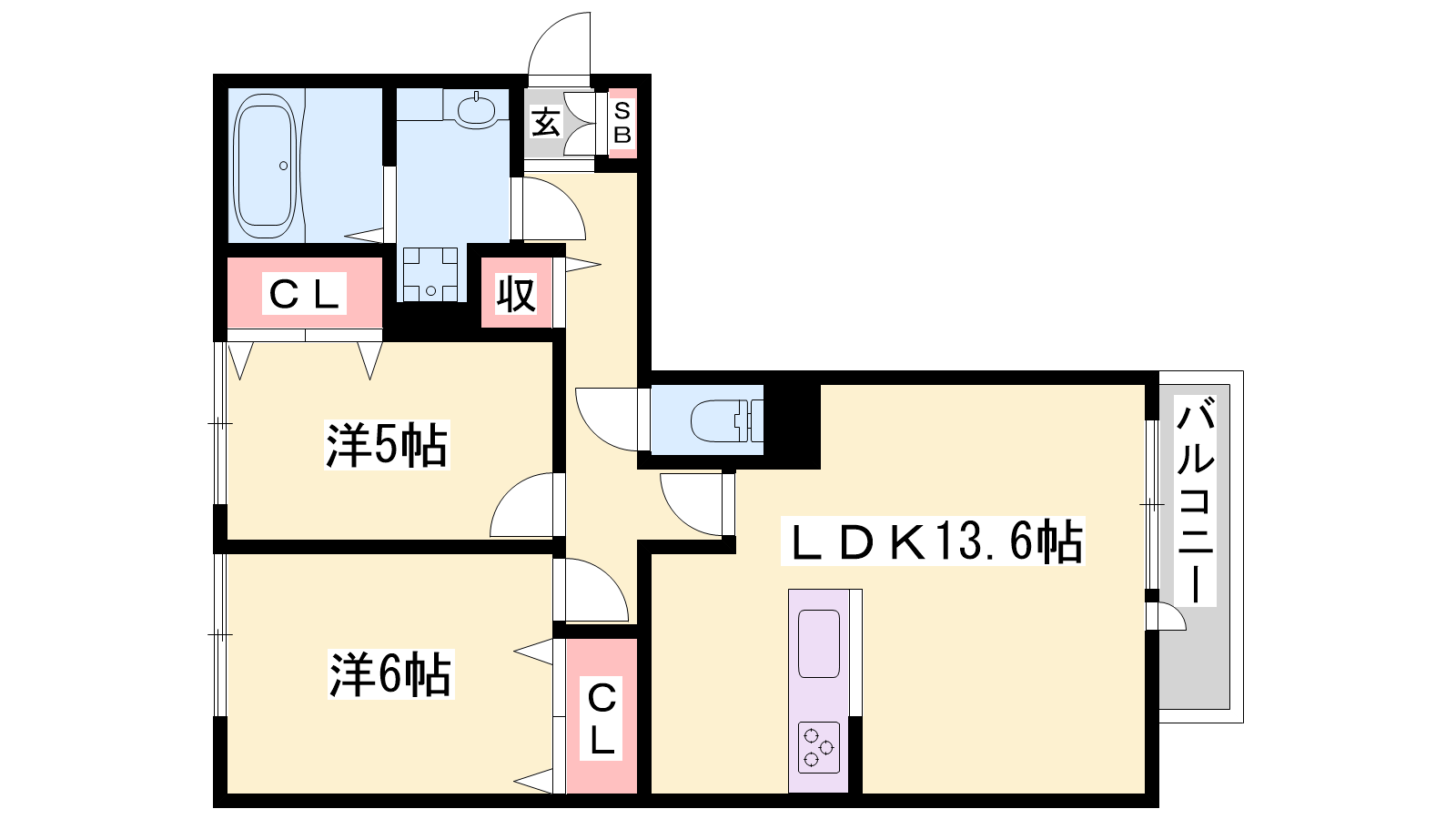 - LDK13.6帖、洋室6帖、洋室5帖