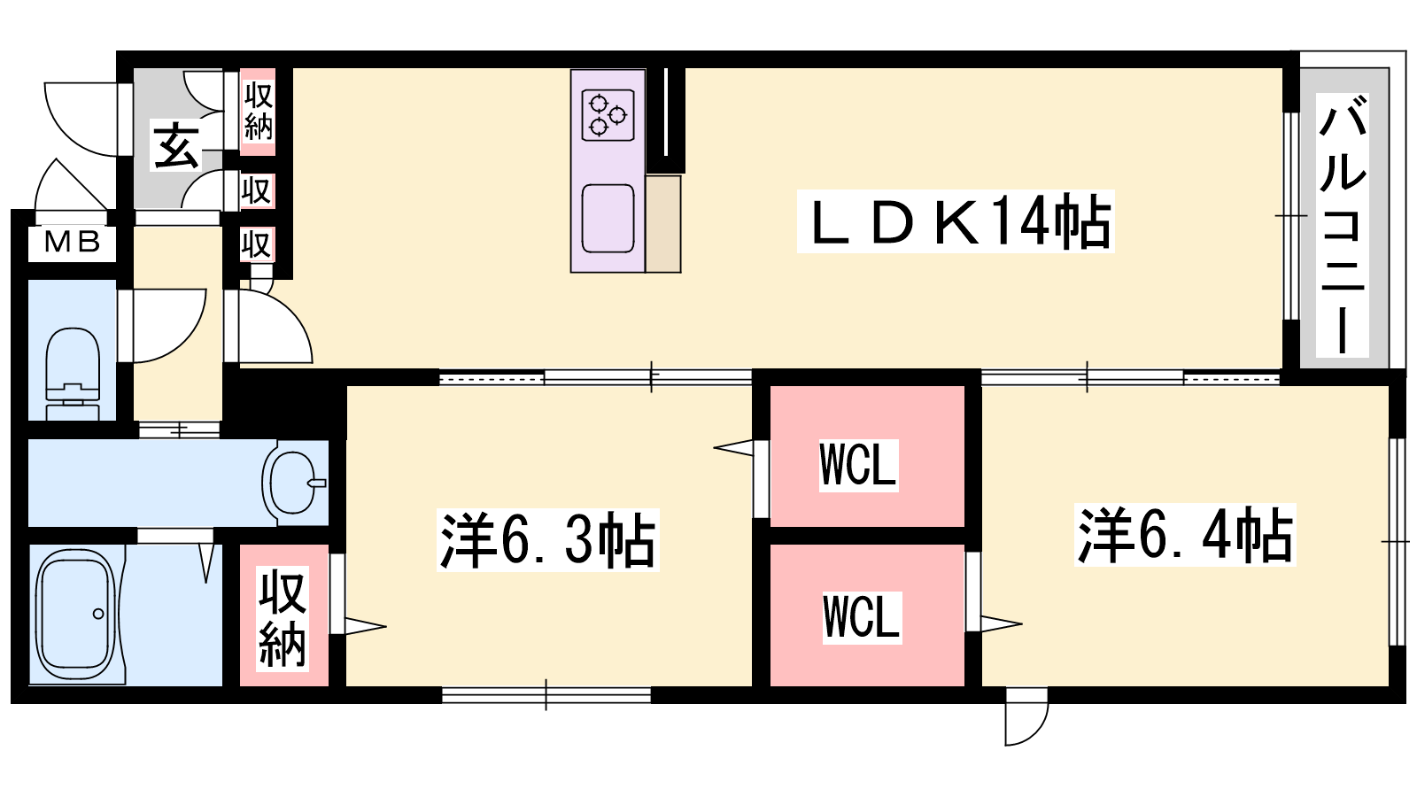 - LDK14帖、洋室6.3帖、洋室6.4帖