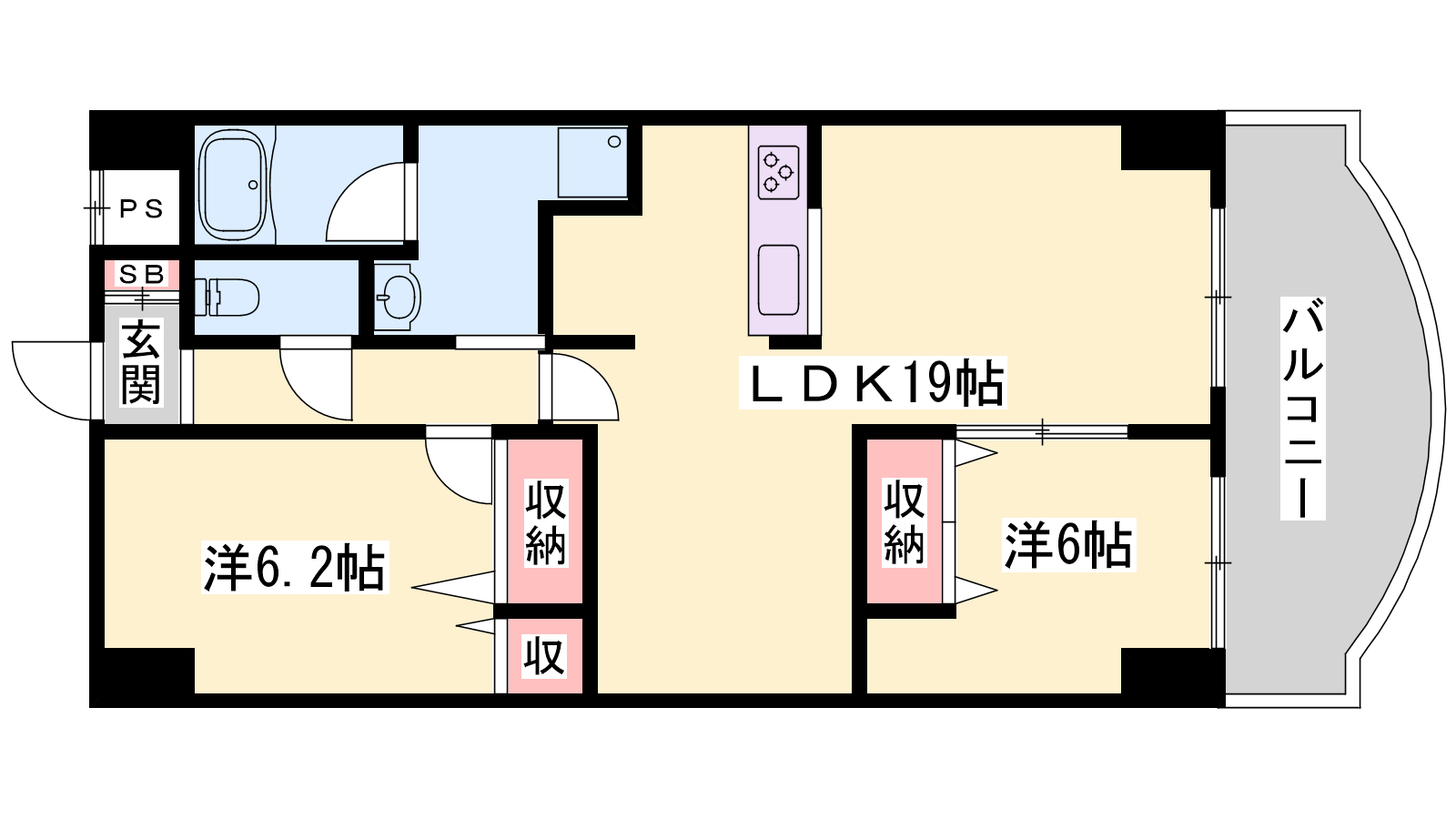 - LDK19帖、洋室6.2帖、洋室6帖