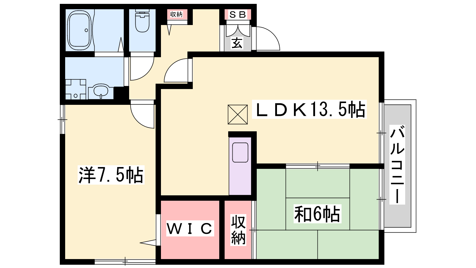 - LDK13.5帖、洋室7.5帖、和室6帖