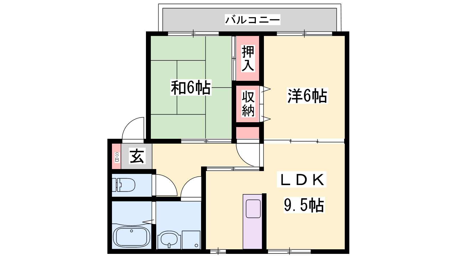 - LDK9.5帖、洋室6帖、和室6帖