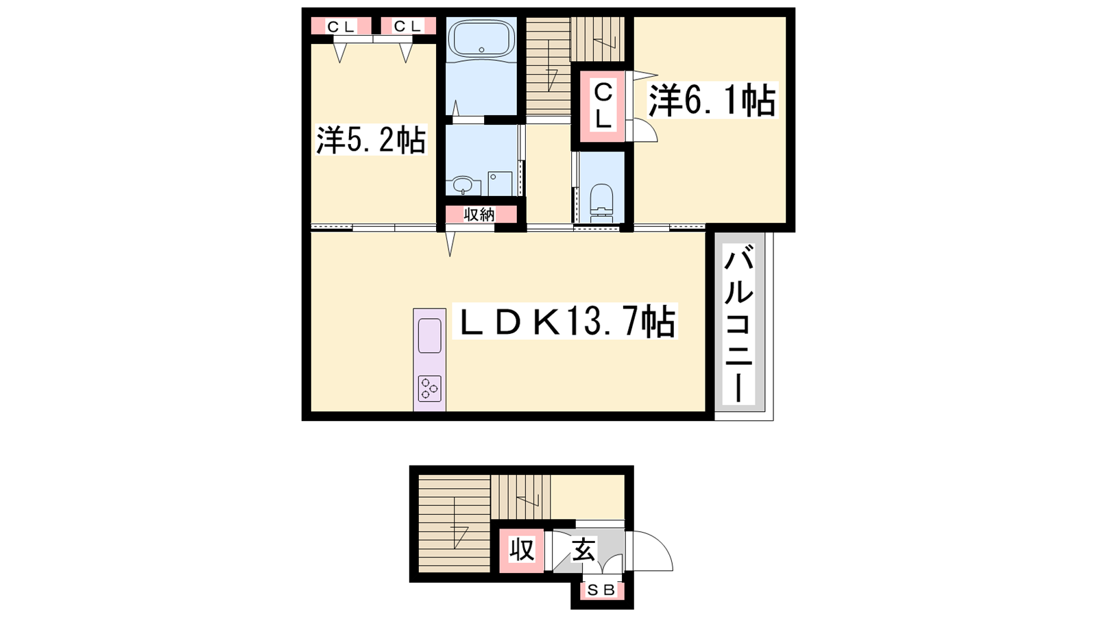 - LDK13.7帖、洋室6.1帖、洋室5.2帖