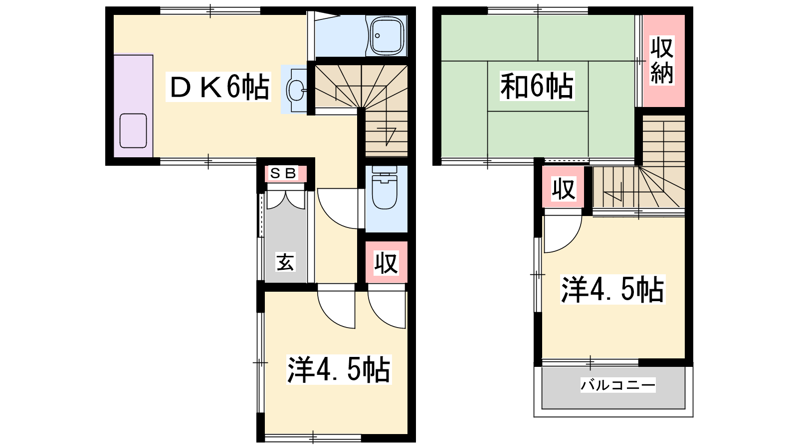 - DK6帖、洋室4.5帖、洋室4.5帖、和室6帖