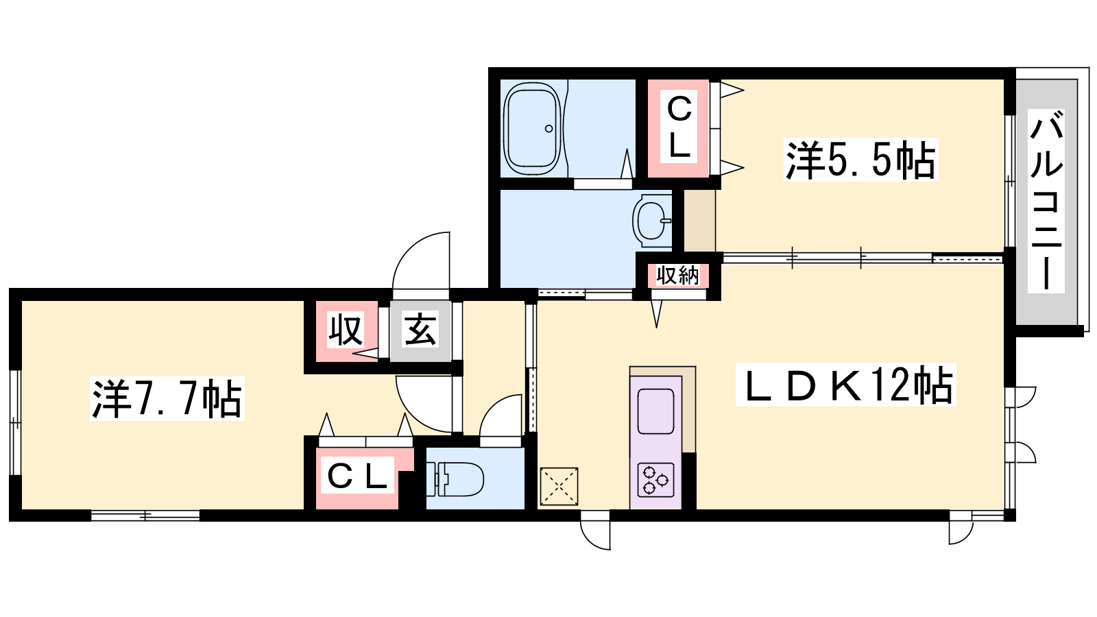 - LDK12帖、洋室7.7帖、洋室5.5帖