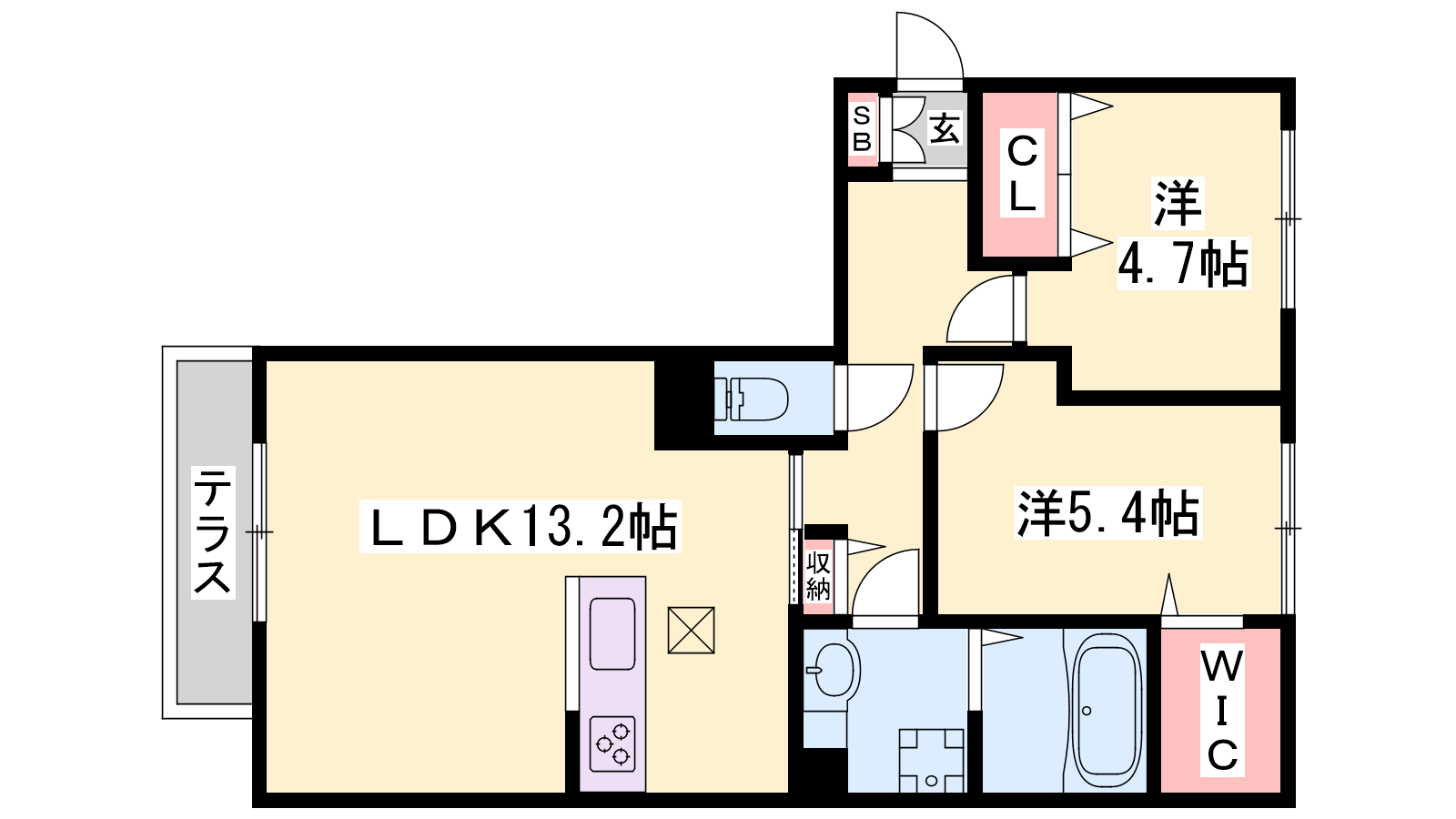 - LDK13.2帖、洋室5.4帖、洋室4.7帖