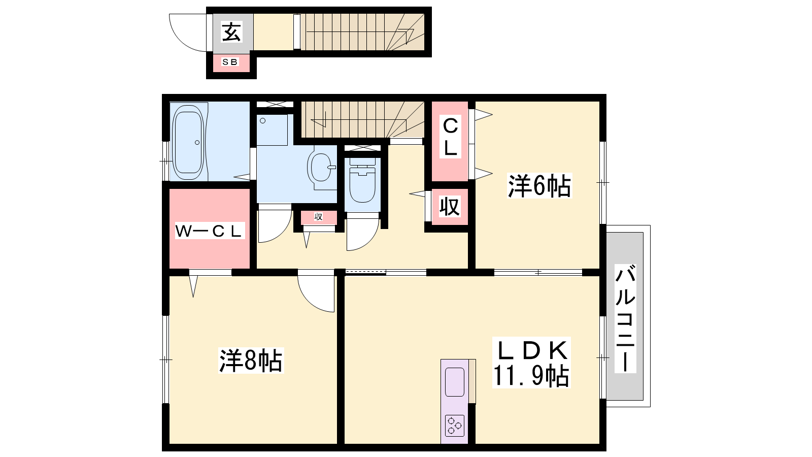- LDK11.9帖、洋室8帖、洋室6帖