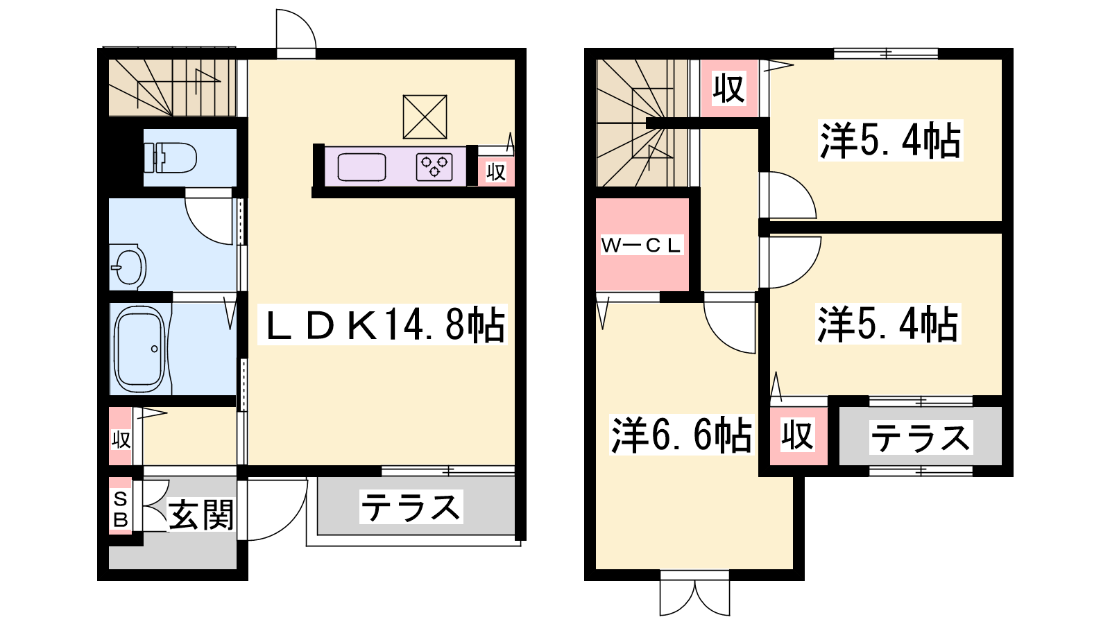 - DK14.8帖、洋室6.6帖、洋室5.4帖、洋室5.4帖