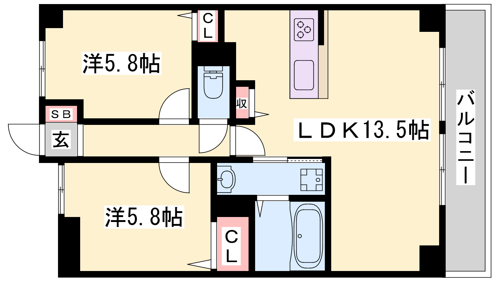 - LDK13.5帖、洋室5.8帖、和室5.8帖