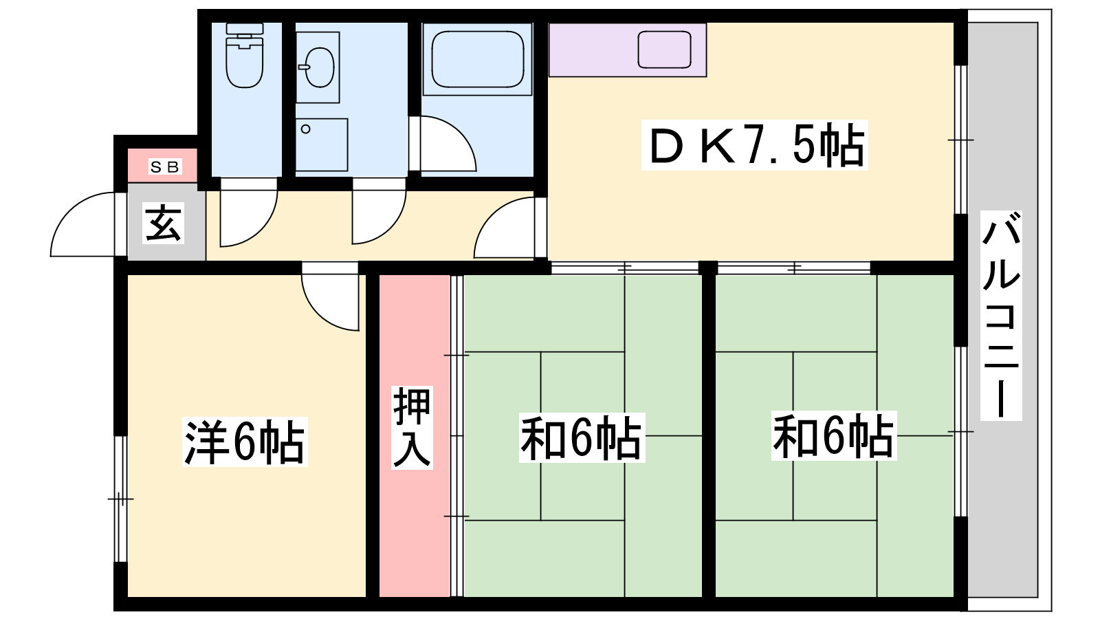 - DK7.5帖、洋室6帖、和室6帖、和室6帖