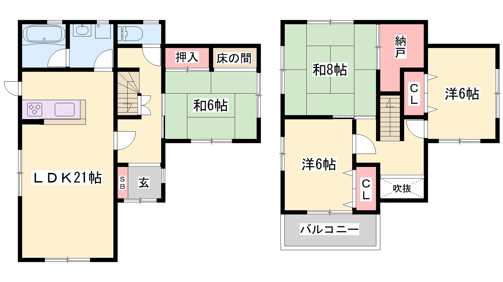 - LDK21帖、洋室6帖、洋室6帖、和室8帖、和室6帖