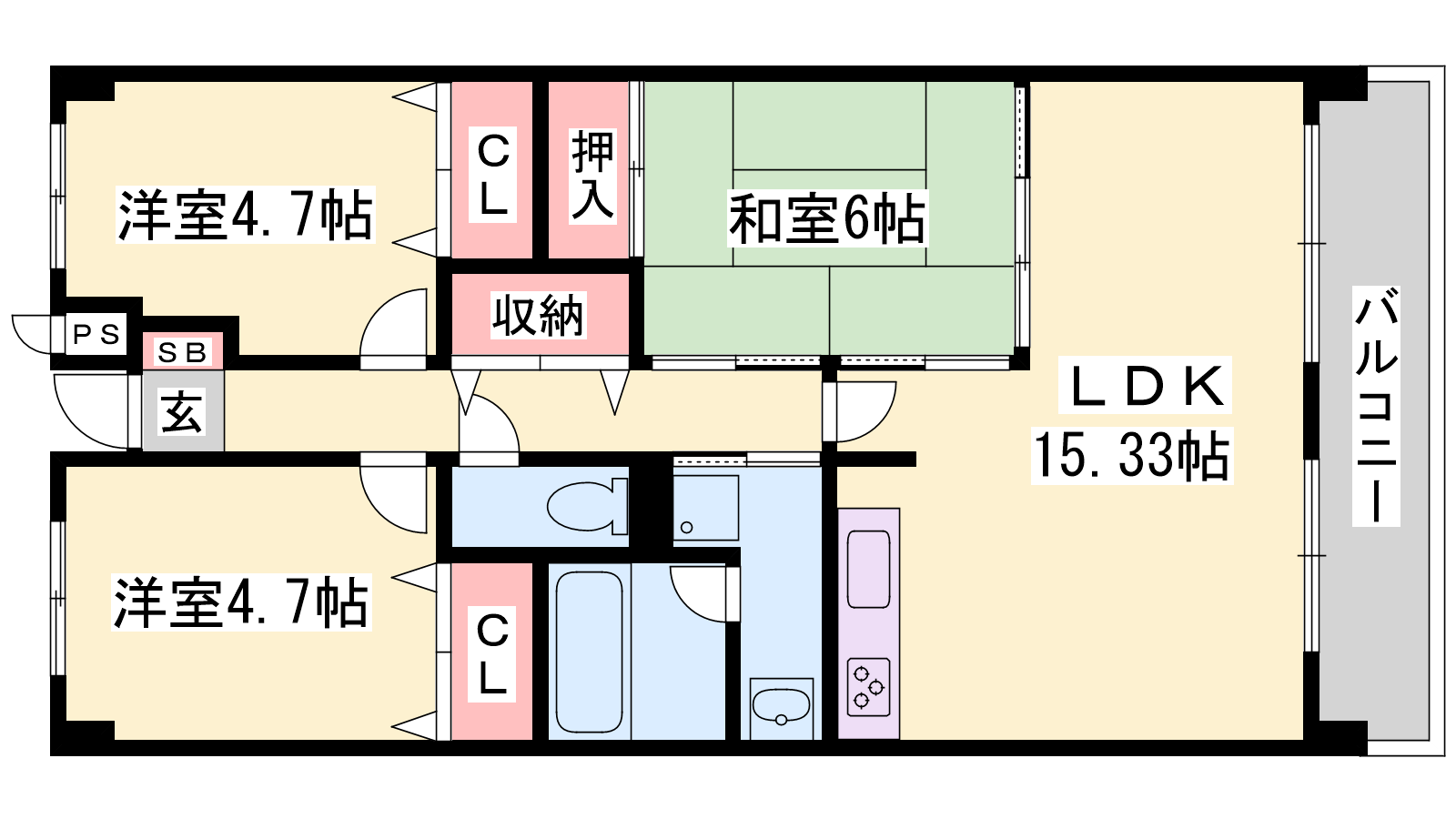 - LDK15.33帖、和室6帖、洋室4.76帖、洋室4.76帖