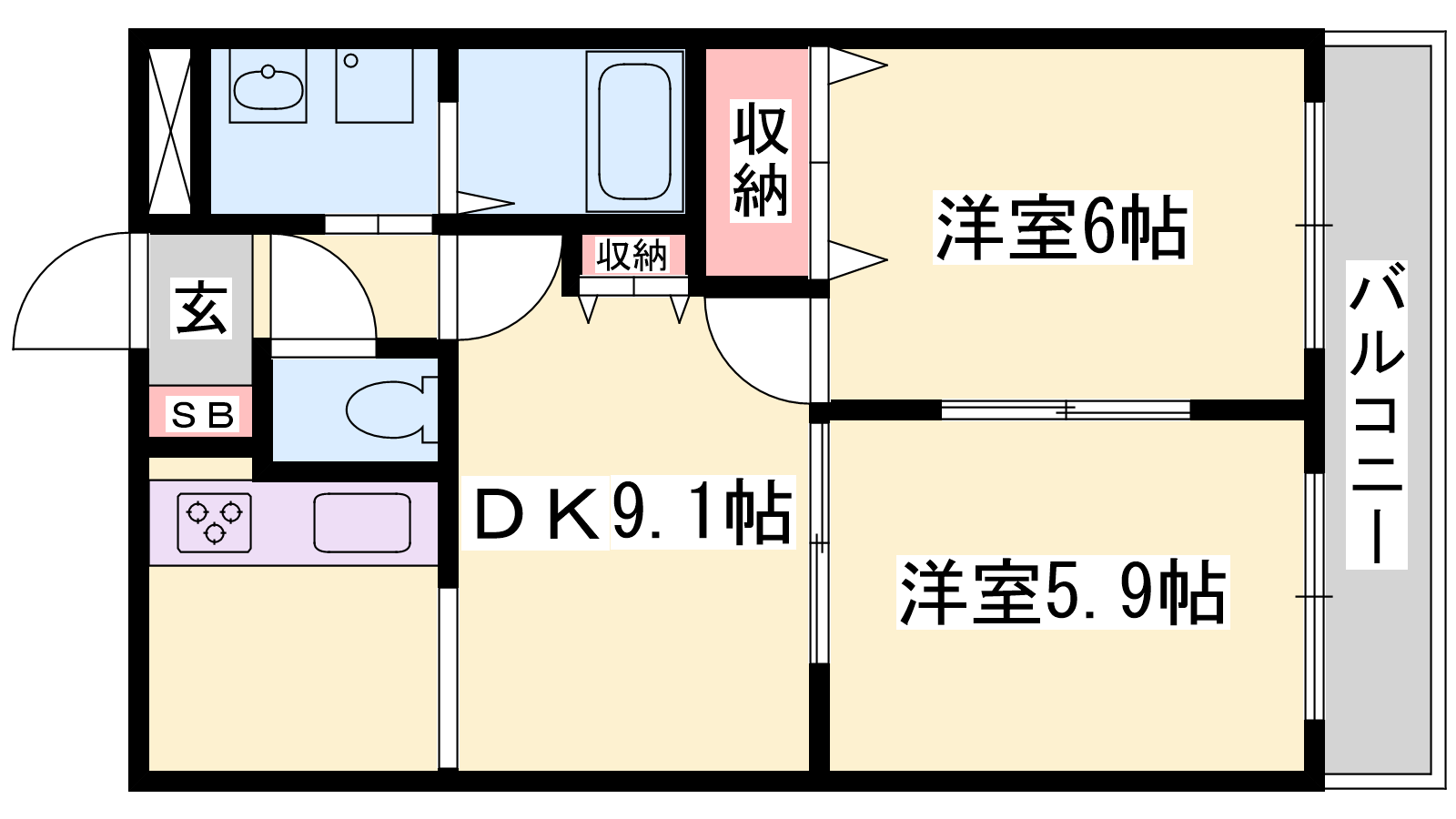 - DK9.1帖、洋室6帖、洋室5.9帖