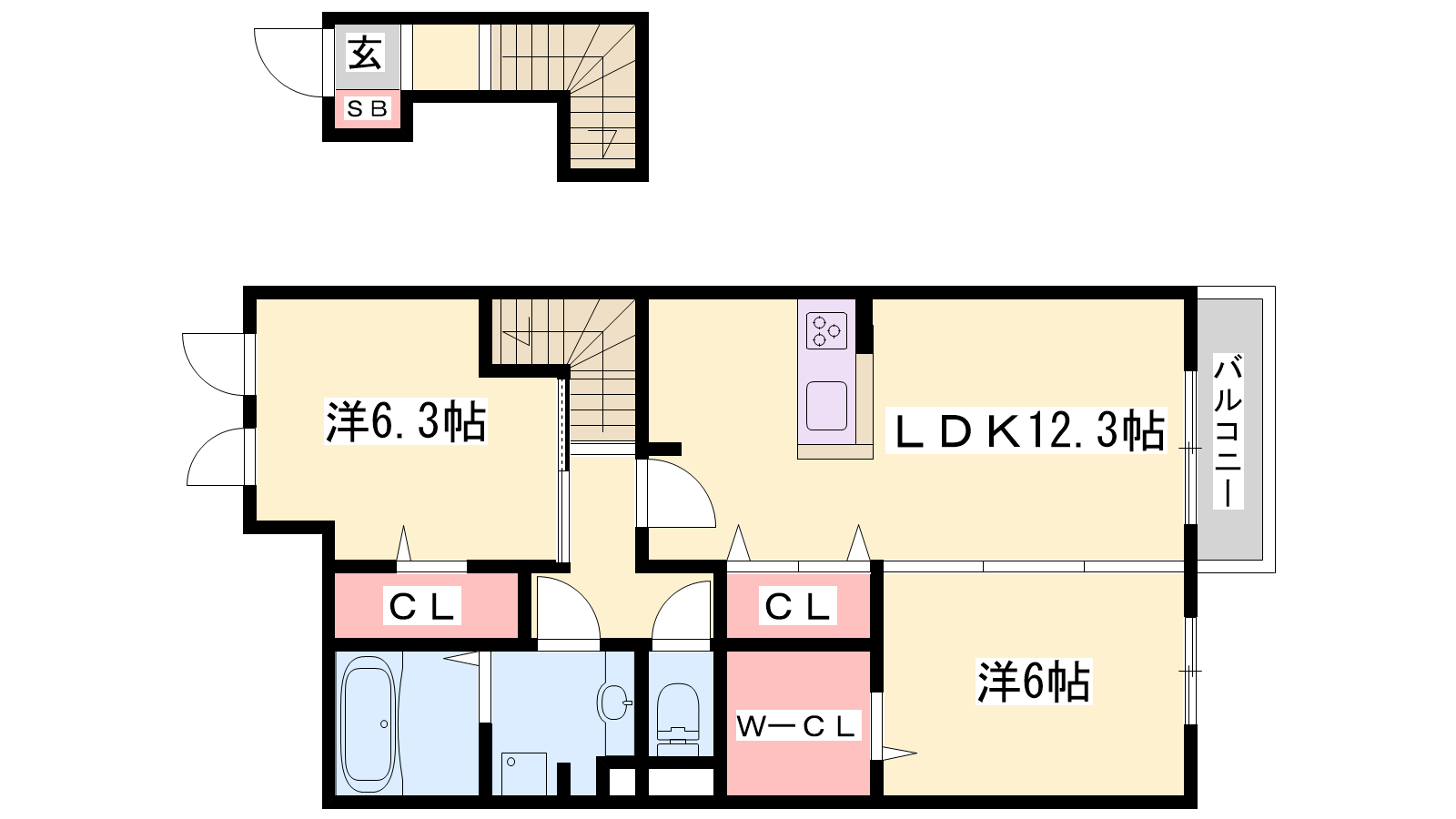 - LDK12.3帖、洋室6.3帖、洋室6帖