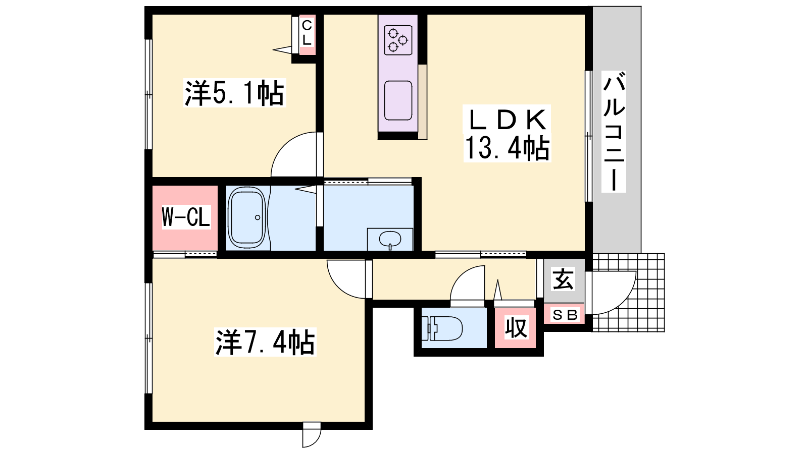 - LDK13.4帖、洋室7.4帖、洋室5.1帖