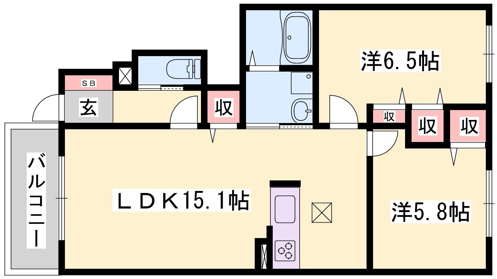 - LDK15帖、洋室6.5帖、洋室5.8帖