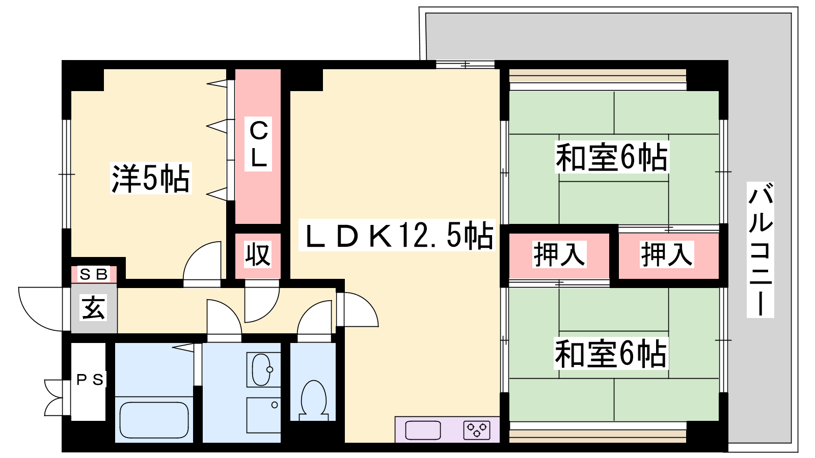 - LDK12.5帖、洋室5帖、和室6帖、和室3帖