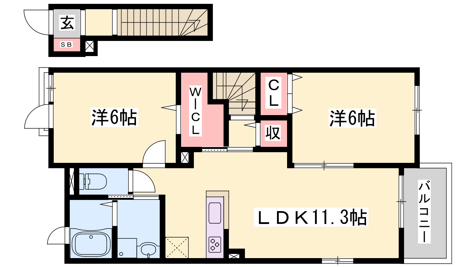 - LDK11.3帖、洋室6帖、洋室6帖