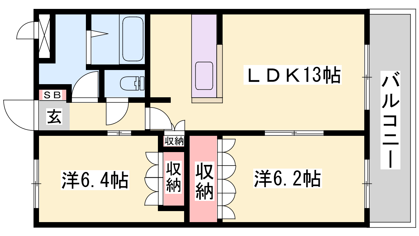 - LDK13帖、洋室6.4帖、洋室6.2帖