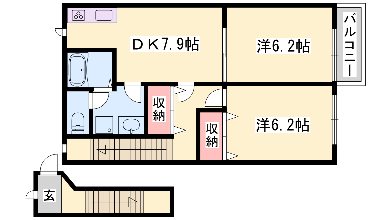 - DK7.9帖、洋室6.2帖、洋室6.2帖