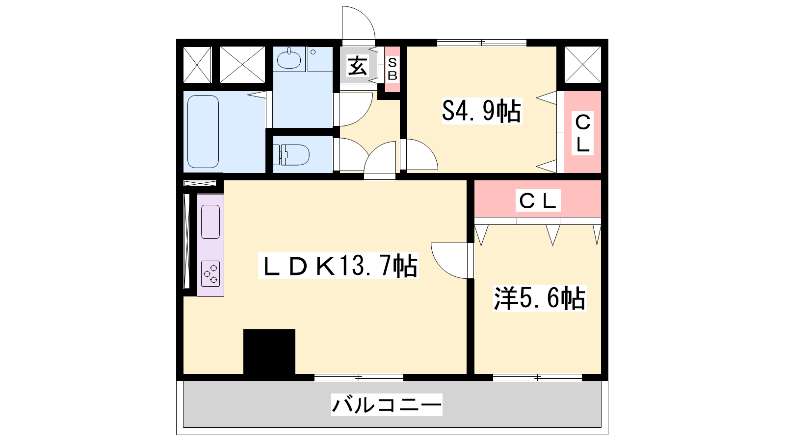 - LDK13.7帖、洋室5.6帖、S4.9帖