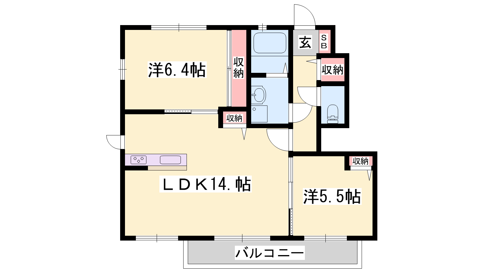 - LDK14.4帖、洋室6.4帖、洋室5.5帖
