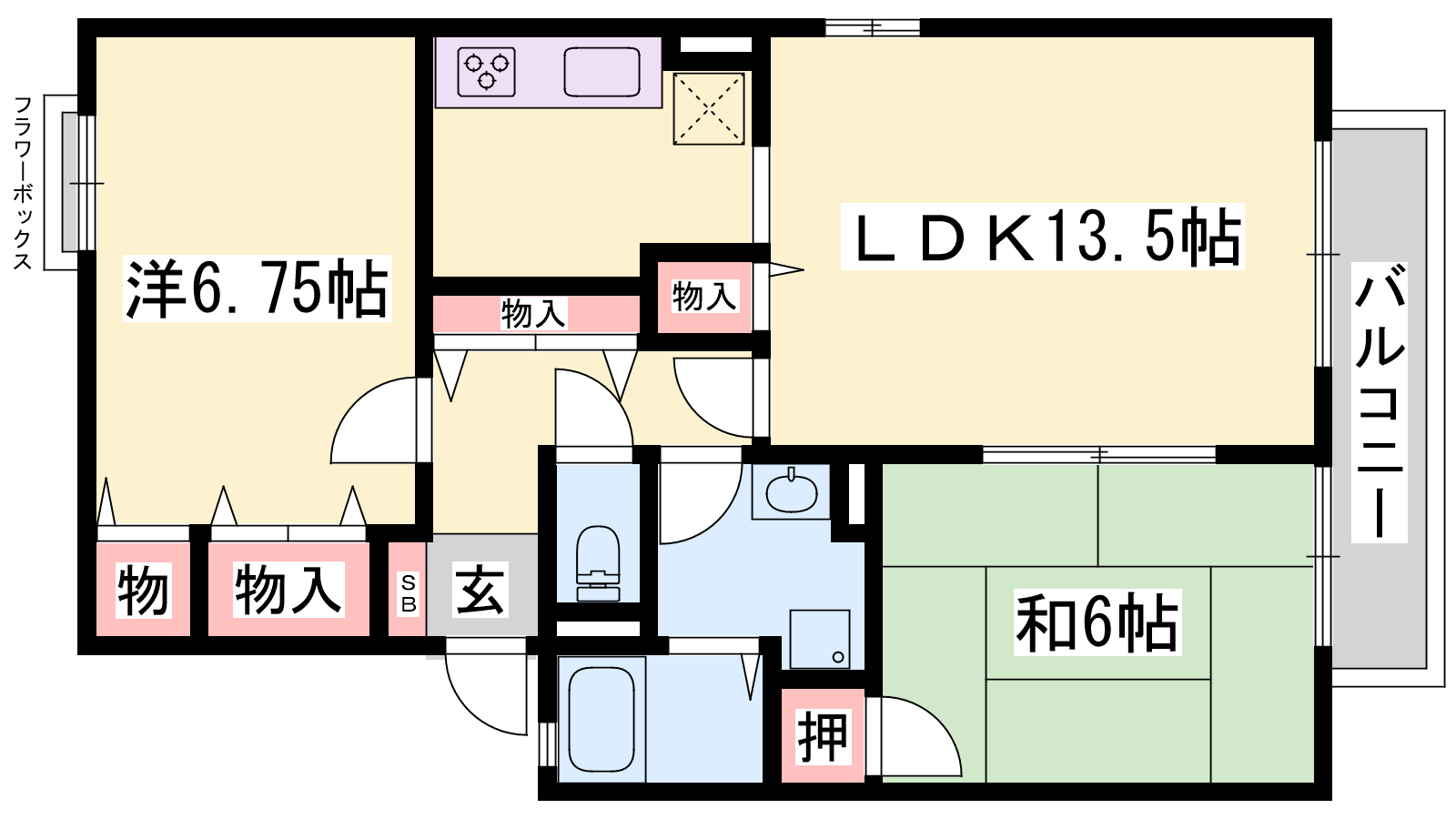 - LDK13.5帖、洋室6.75帖、和室6帖