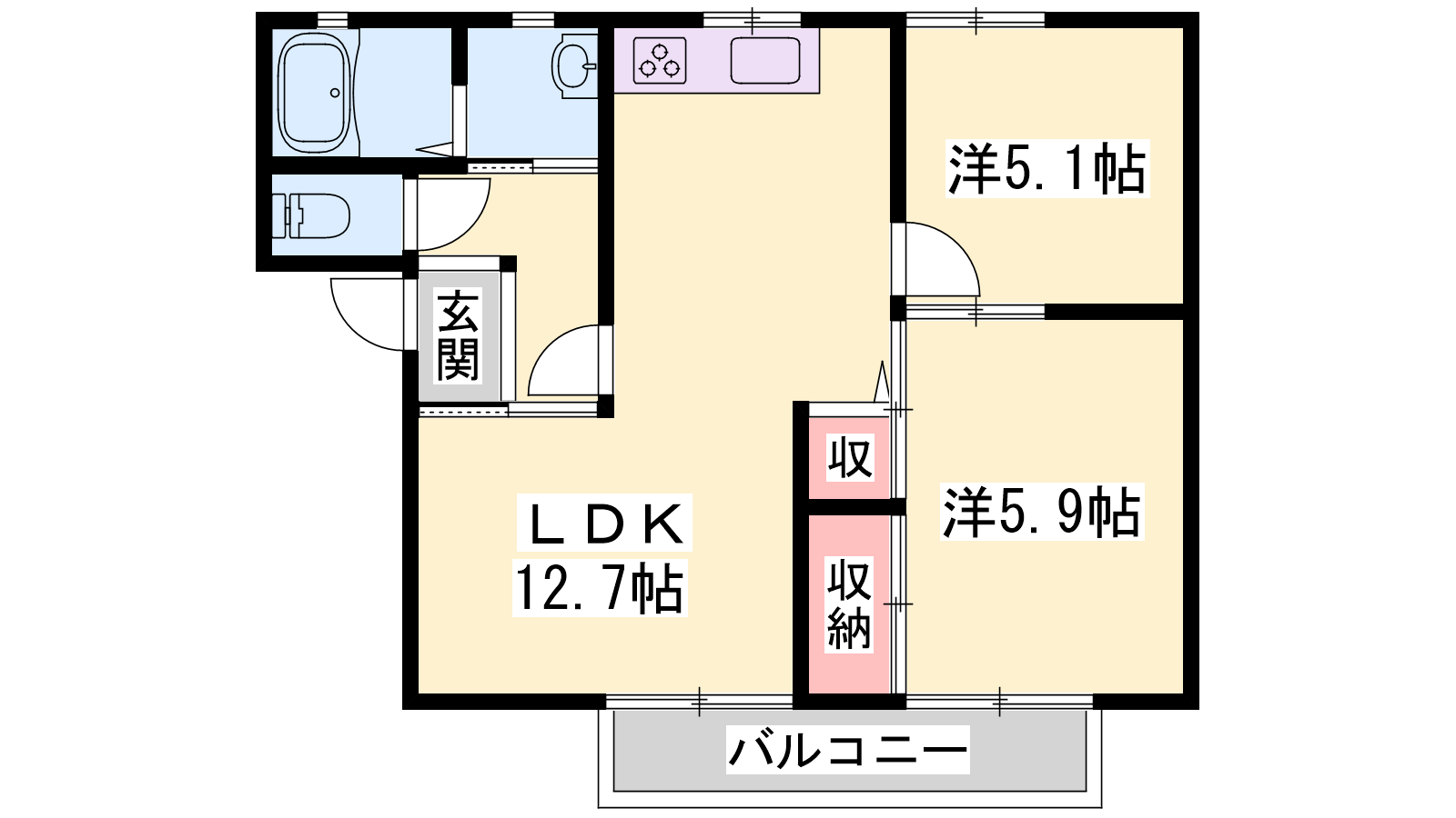 - LDK12.7帖、洋室5.9帖、洋室5.1帖