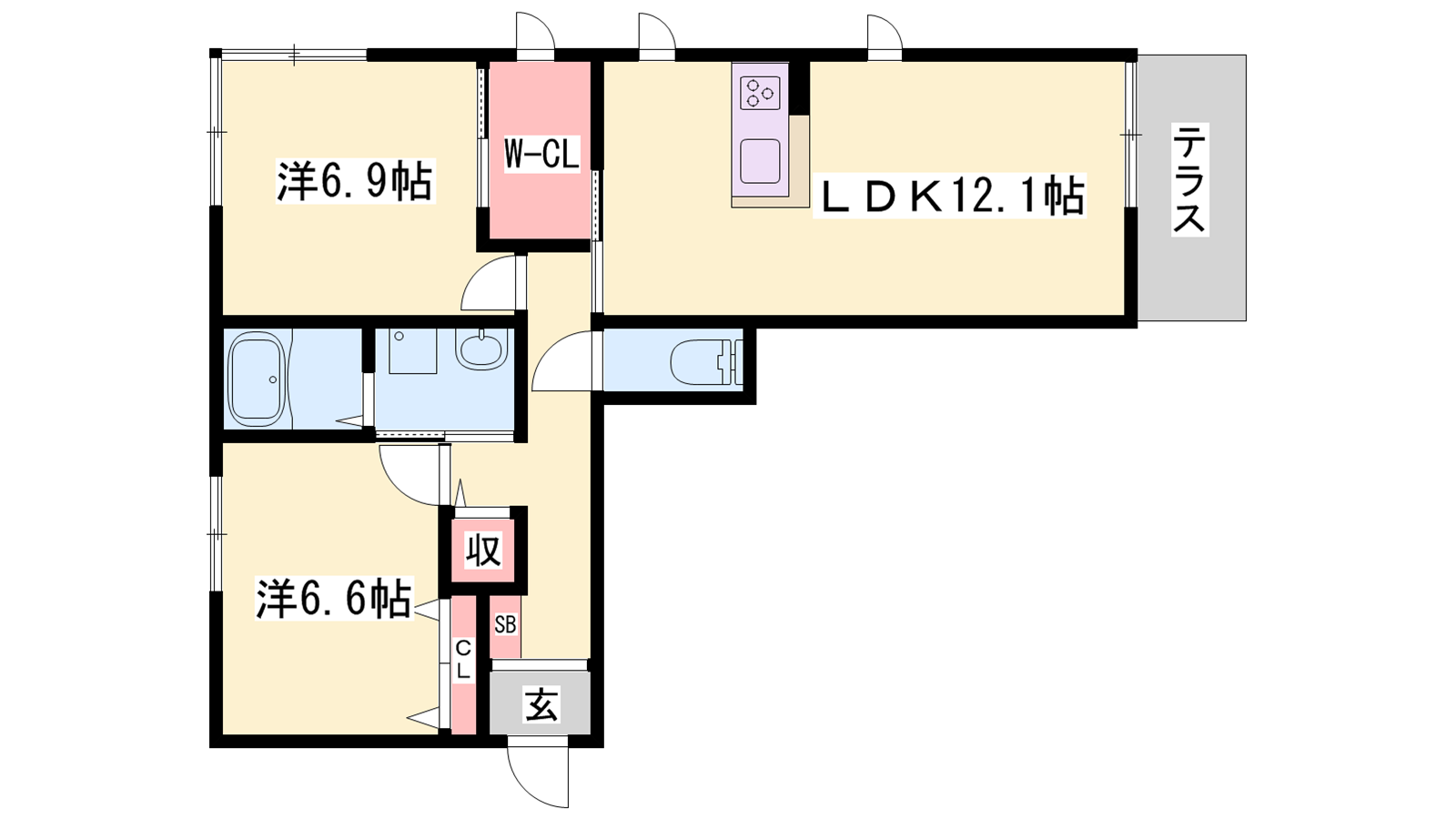 - LDK12.1帖、洋室6.9帖、洋室6.6帖