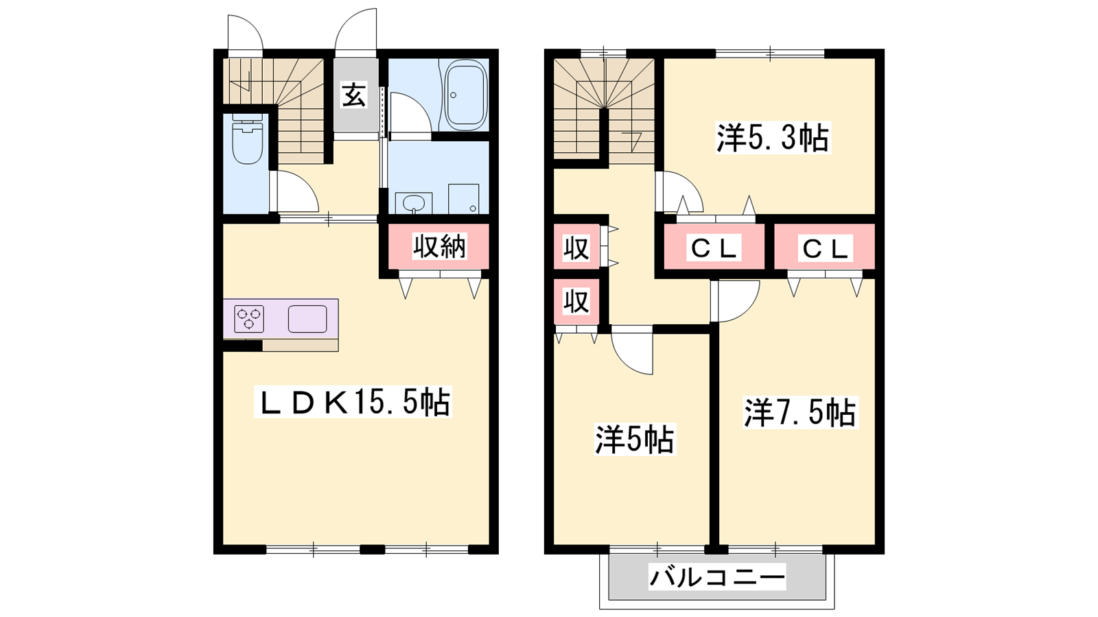 - LDK15.5帖、洋室7.5帖、洋室5.3帖、洋室5帖