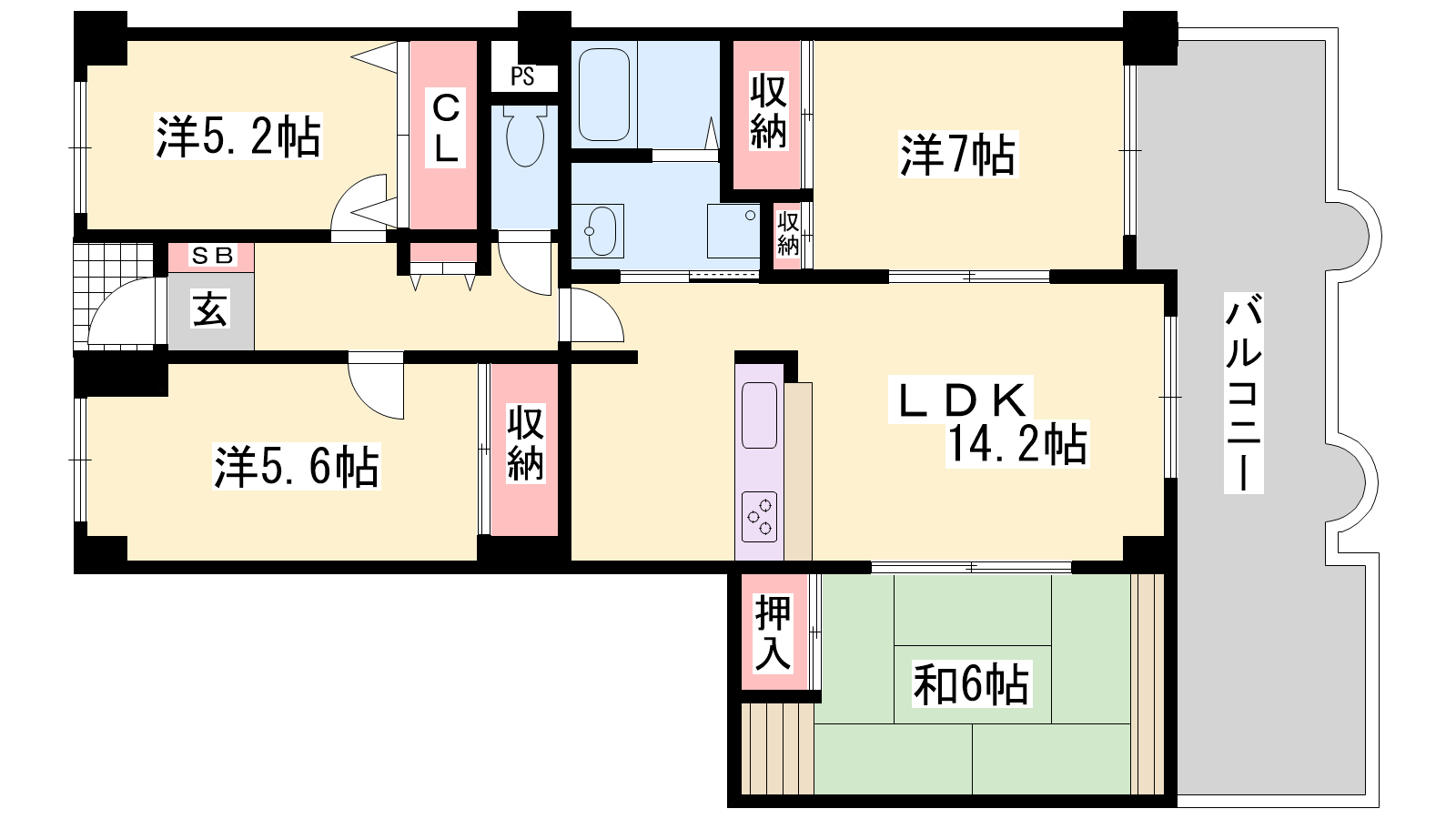 - LDK14.2帖、和室6帖、洋室7帖、洋室5.6帖、洋室5.2帖