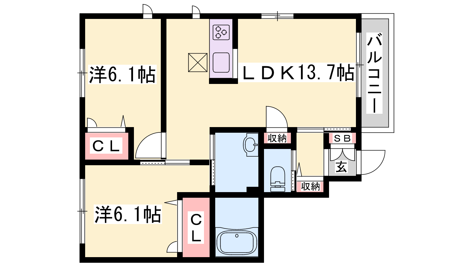 - LDK13.7帖、洋室6.1帖、洋室6.1帖