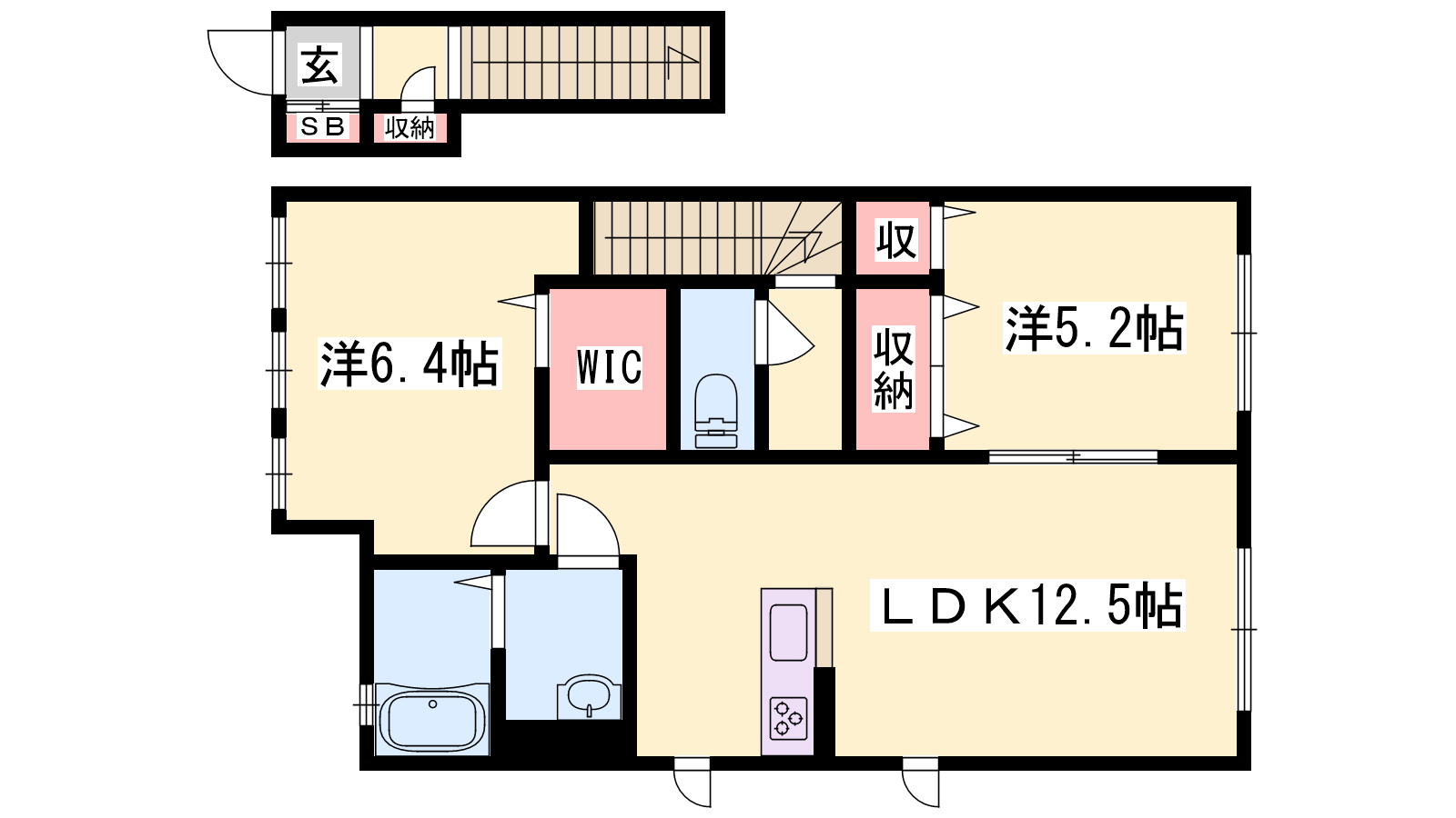 - LDK12.5帖、洋室6.4帖、洋室5.2帖