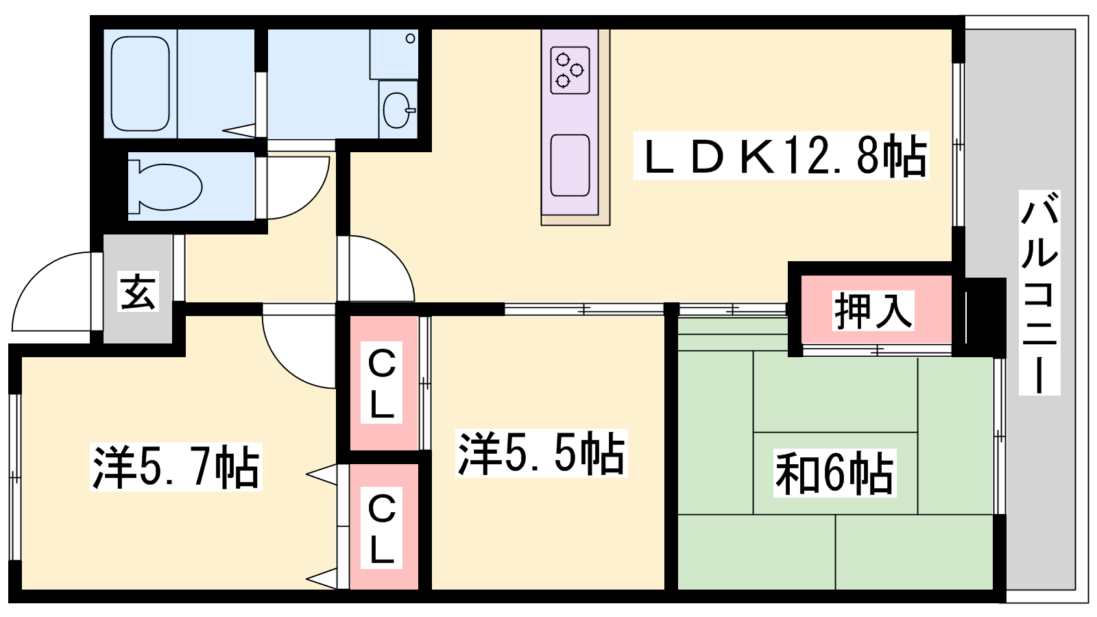 - LDK12.8帖、和室6帖、洋室5.5帖、洋室5.7帖