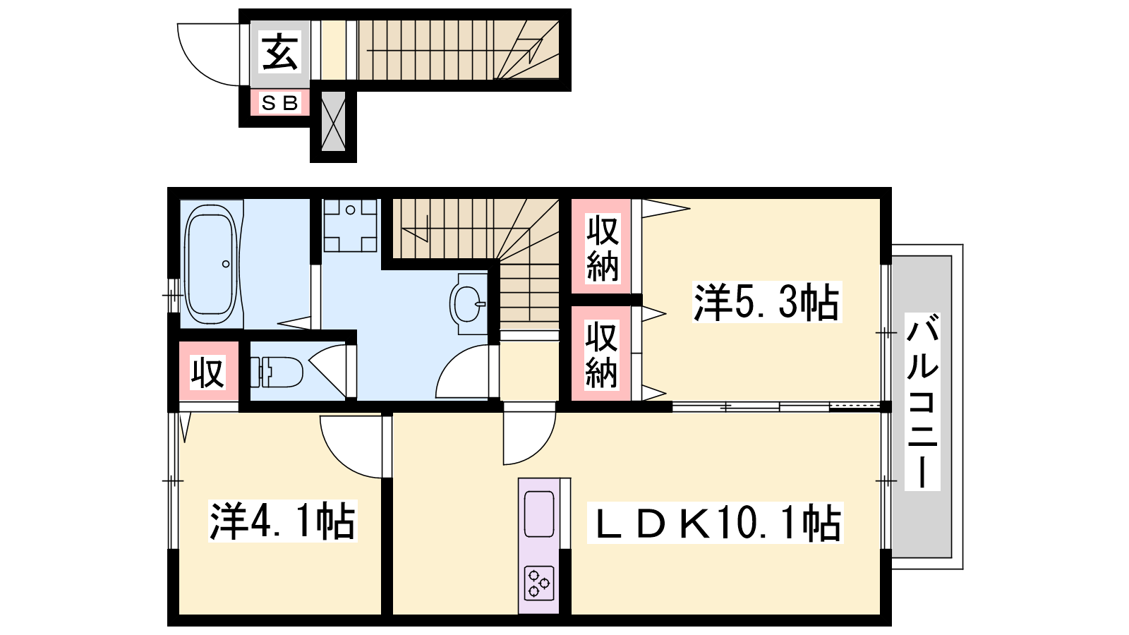 - LDK10.1帖、洋室5.3帖、洋室4.1帖