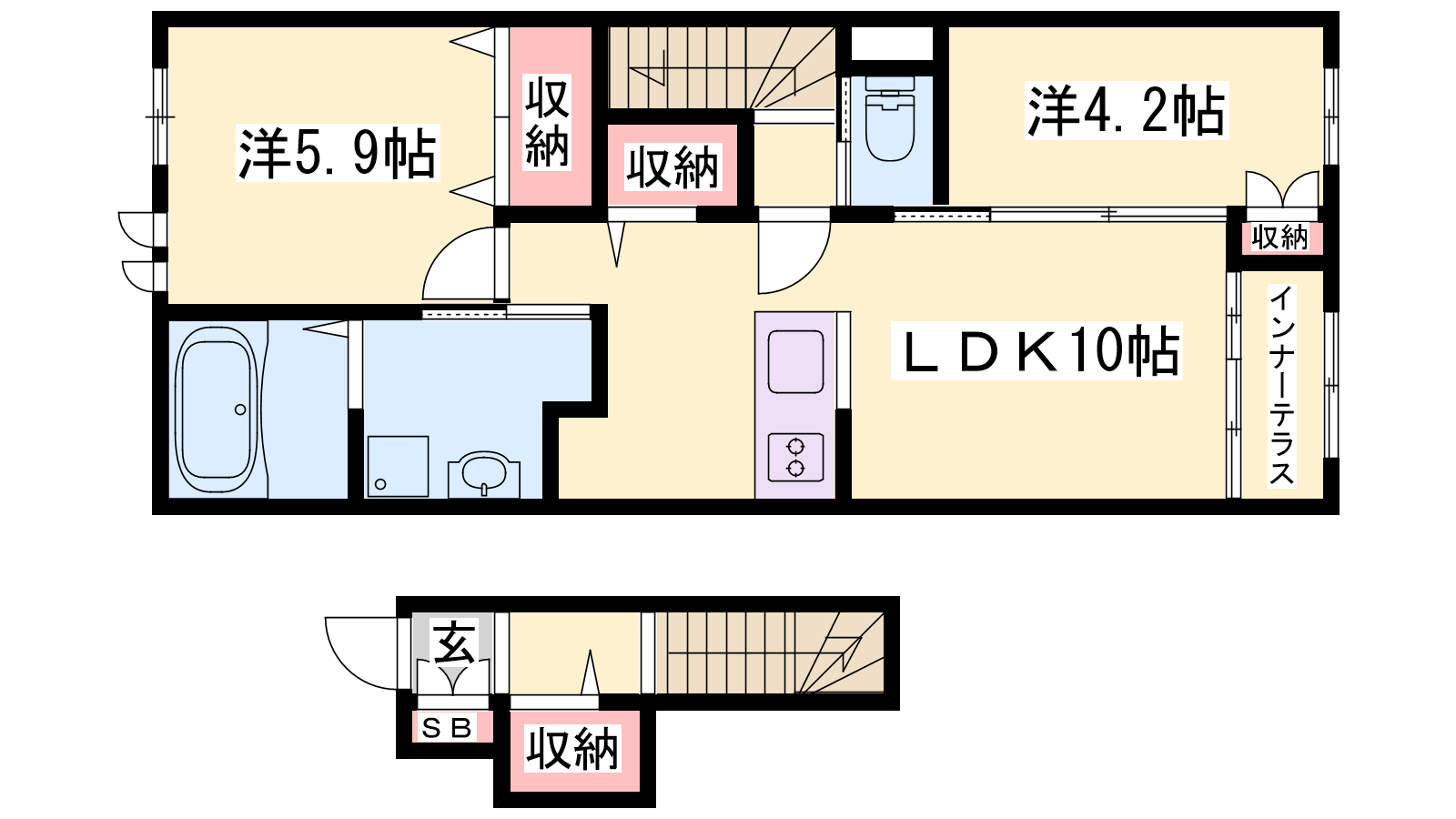 - LDK10帖、洋室5.9帖、洋室4.2帖