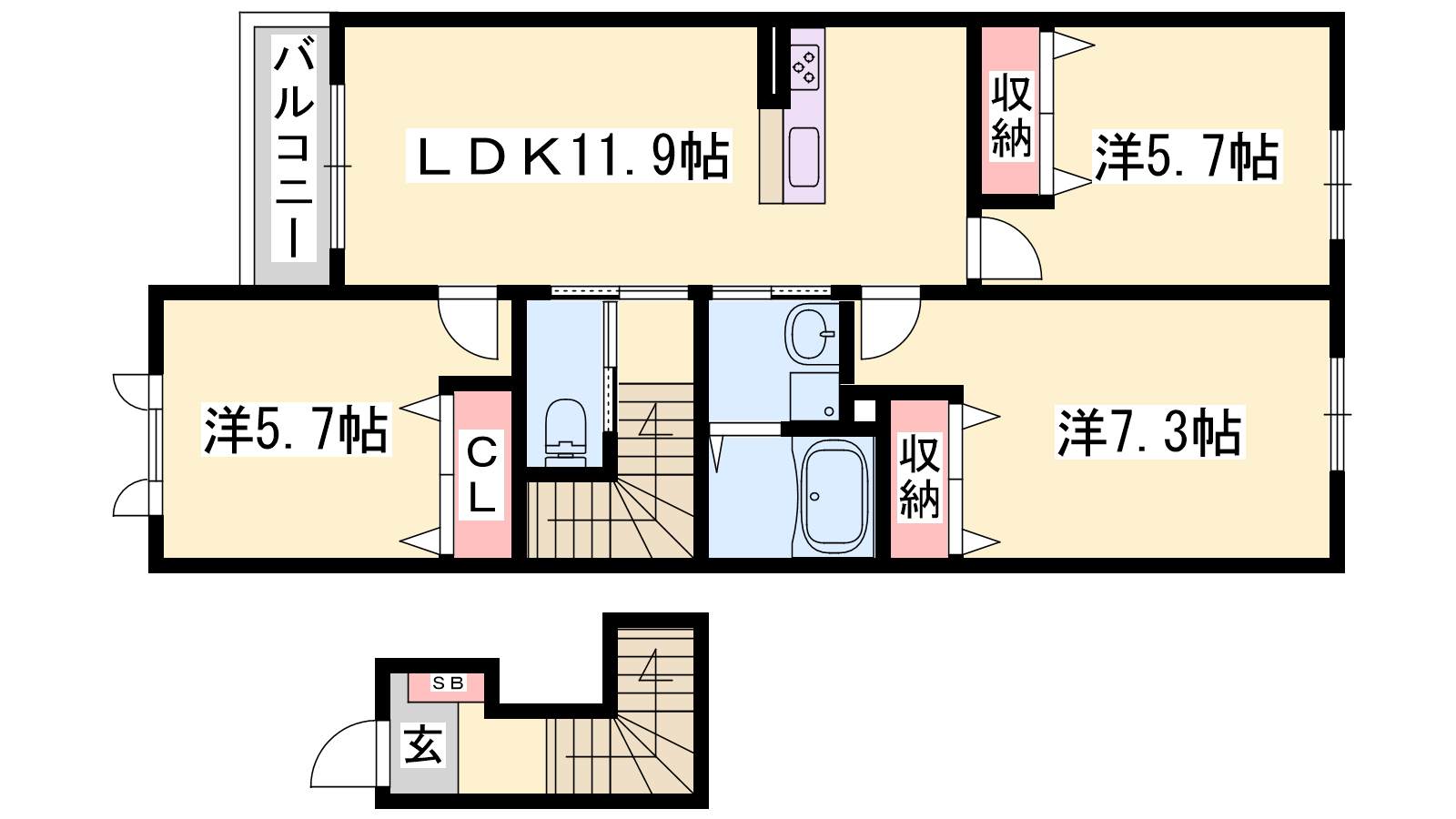 - LDK11.9帖、洋室7.3帖、洋室5.7帖、洋室5.7帖