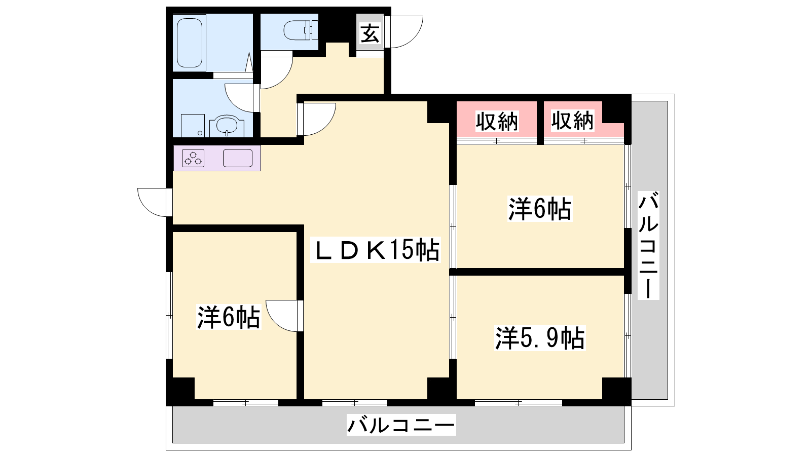 - LDK15帖、洋室6帖、洋室6帖、洋室5.9帖