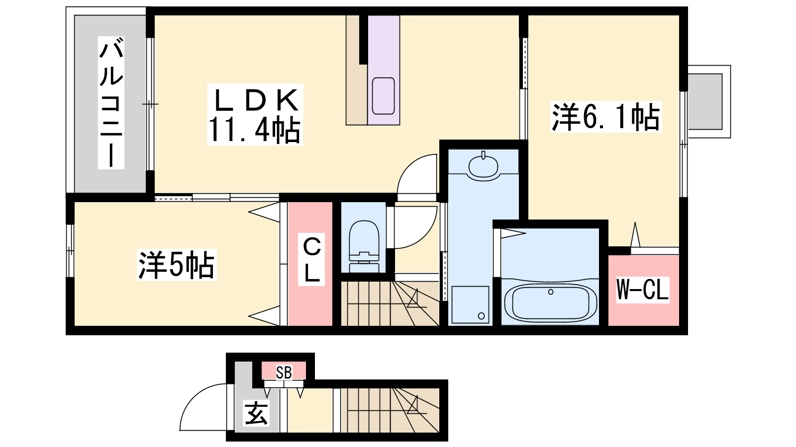 - LDK11.4帖、洋室6.1帖、洋室5帖