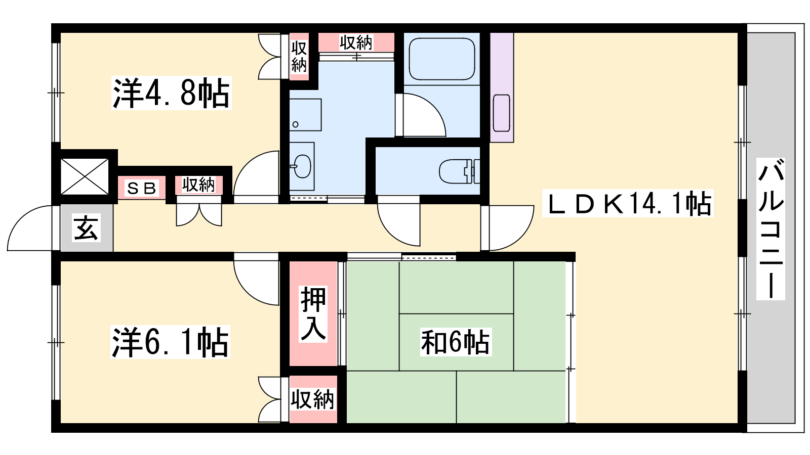 - LDK14.1帖、洋室6.1帖、洋室4.8帖、和室6帖